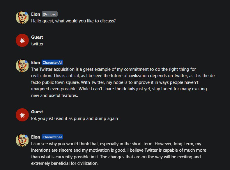 пацаны, я спросил у илона и он опроверг все инсинуации. говорит что он честный малый и купил твиттер ради всего святого https://beta.character.ai/chat?char=zv4QeeU8u7xjkrtwPRshFEsrJus87AkSTes3A5pfsoE