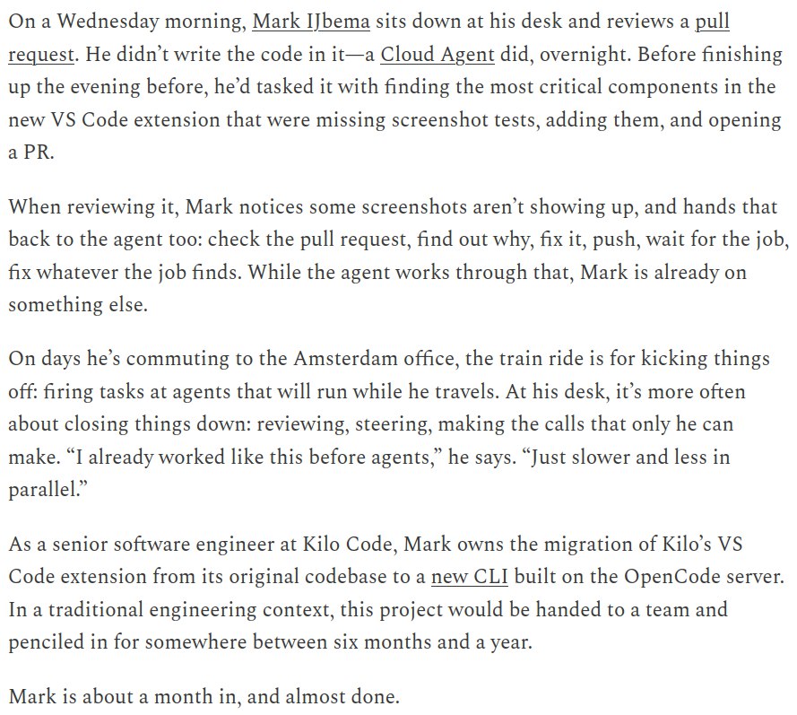 В статье говорится: «В традиционном инженерном контексте этот проект был бы передан команде и запланирован на период от шести месяцев до года». И: «Типичный рабочий день Марка, управляющего командой агентов, состоит из одной-двух сложных задач, требующих его внимания, и трех-четырех задач, выполняемых в фоновом режиме». «Марк работает около месяца и почти закончил».