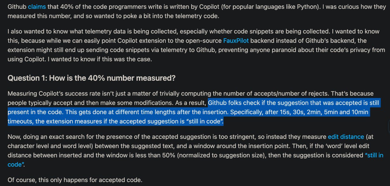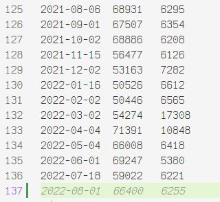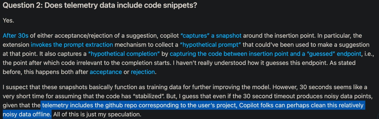 для тех кто думает что copilot "просто копипастит GPL код из того что лежит на гитхаб". есть у меня простой текстовый файл с колонками: дата и две колонки значений на эту дату. на скриншоте я нажал enter вконце 136й строки и то что выделено зеленым -- результат который предложил copilot. он не только правильно угадал дату (видя что большая часть данных введена в первых числах нового месяца), но и предложил два других числа, которые имеют смысл в контексте исторических данных!