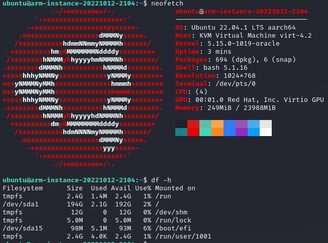 Оказалось что оракл в рамках своего аттракциона невиданной щедрости предоставляет 4 ядерный АРМ и 24 гб рам под 200гб ССД. В дополнение белый айпи 4 и подсеть айпи 6. И все это безвозмездно!