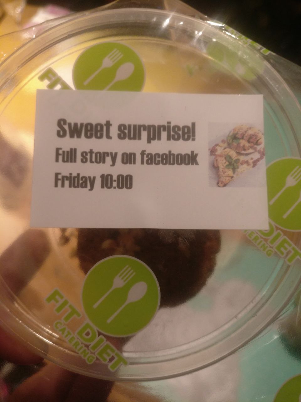 Компания которая приносит мне еду каждый день сегодня прислала пирожок с запиской "сладкий сюрприз! Подробнее в пятницу в 10 утра в Фейсбуке".