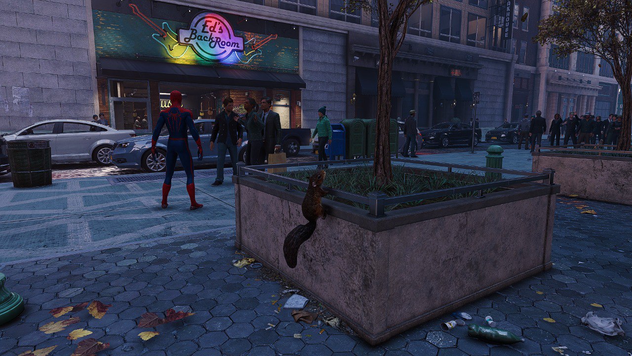 сижу, изучаю ньюйорк в новом спайдермэне, смотрю посреди города, в небольшом закоулке с деревьями сидит белка!